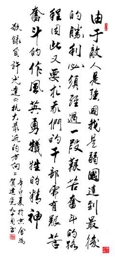 由于敌人是强国,我是弱国,达到最后的胜利必须经过一段艰苦奋斗的路程, 因此又要求我们的干部,需有艰苦奋斗的作风,英勇牺牲的精神。 ——许光达《抗大最近的方向》