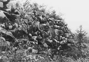 于、蒋之间对某些具体遗迹确认方面的歧异,有待进一步探讨。但就笔者所见,一些主要的古城、墙体、营盘、古石路十分典型,清晰可辨。平心而论,在至今人迹罕至的荒山野岭一线排开堆放石块用以“保持水土”之类的推测,实在匪夷所思。蒋称“所看到的地埂、石埂及石堆……,连猪、牛、羊等牲畜都阻拦不住”云云,也多少带点意气用语的味道。即使今天某些残存地段阻挡不住牛羊,也不能证明当初无法“御敌”。经过两千来年的风雨侵蚀和社会动荡,呈现此种风貌的战国、秦汉长城遗迹亦非仅见。