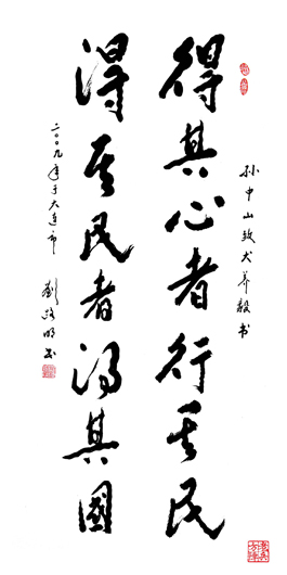 "组委会: 当此庆祝建国六十周年之际,你们提出的“以人民本”的书法活动是很有意义的.我们都是老兵了,在战争期间,深知兵民是胜利之本的道理。经济建设也是一样,一点也不能脱离人民,以胡锦涛为总书记的党中央,提出科学的发展观,是很正确的,适时的。相信我国前景更加美好。 -----刘路明 2009.5.22 "