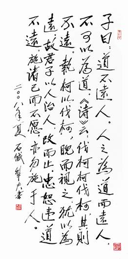 子曰:道不远人。人之为道而远人,不可以为道。《诗》云:伐柯柯伐柯,其则不远。执柯以伐柯,睨而视之,犹以为远。故君子以人治人,改而止。忠恕违道不远。施诸己而不愿,亦勿施于人。